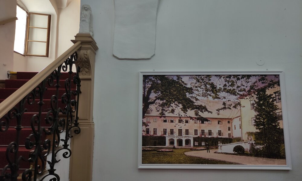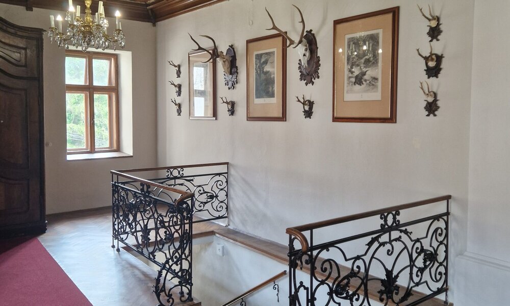 Prohlídková trasa vás zavede do postupně obnovovaných částí východního a severního křídla. V prvním patře navštívíte vstupní halu hraběcího bytu a přilehlý věžový pokoj, nahlédnete do salonu hraběnky, ložnice hraběcích manželů a pracovny hraběte z Harrachu s dochovaným dřevěným obložením. Dále uvidíte historickou toaletu skrytou v intarzované skříni a přírodovědný kabinet, který je připomínkou někdejšího loveckého a lesnického muzea. Knihovna zaujme atmosférou pánského společenského salonu z počátku 20. století, zatímco elegantní jídelna vybavením ve stylu druhého rokoka. Komornický pokoj připomene hraběcího řidiče Leopolda Lojku a sarajevský automobil. Prohlídku zakončíte v zámecké kapli s obnovenou výmalbou a okenními vitrážemi z konce 19. století.